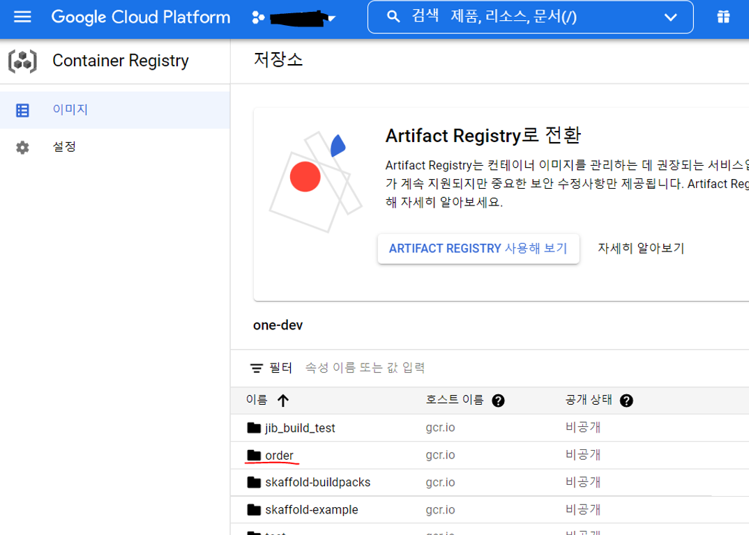 # Container Registry 웹 콘솔에서 Build된 도커 컨테이너 이미지를 확인 할 수 있습니다.