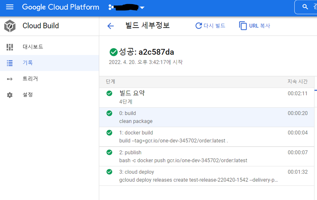 # GCP의 Cloud Build 웹 콘솔에서 최근에 빌드 된 내역과 과정을 확인 할 수 있습니다.